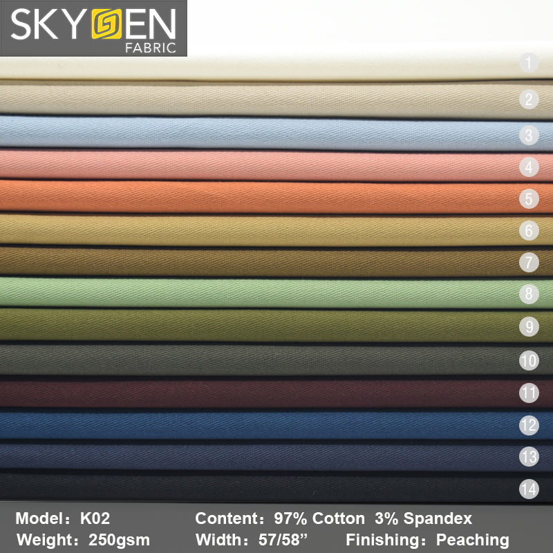 Home / Solid Fabric / K02 Stretch Cotton Spandex Peaching Fabric K02 Stretch Cotton Spandex Peaching Fabric Item No.:K02 Material: 97% Cotton 3% Spandex Weight:250gsm Width: 57/58” Finishing: Peaching SKU: K02 Categories: Cotton Fabric, Pants Fabric, Solid Fabric, Stretch Cotton Fabric Related products C7126 Dobby Woven Cotton Fabric ML003 Herringbone Peaching Melange Fabric OX42 Oxford Cloth Fabric 100% Cotton DN01 Cotton Denim Fabric (135gsm)